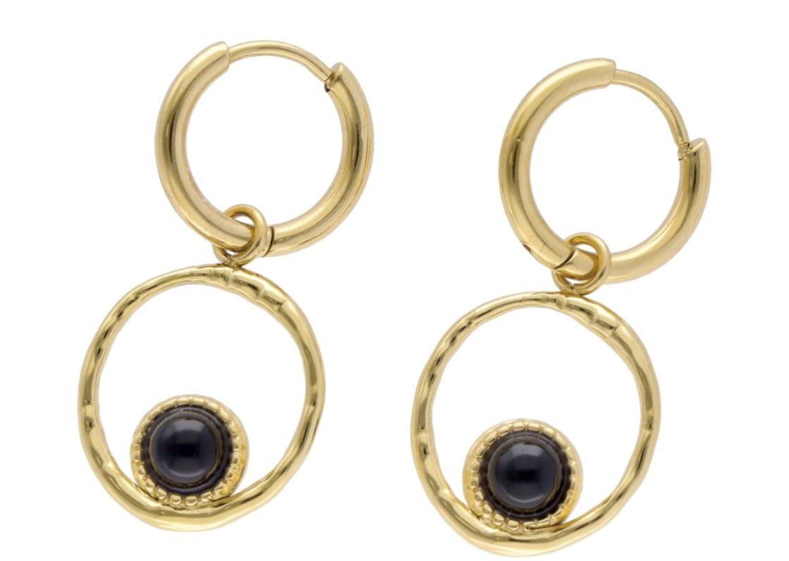 Zachwycające kolczyki, które łączą w sobie subtelność i artystyczny charakter. Wykonane ze stali szlachetnej w ciepłym złotym odcieniu, ozdobione onyksowym oczkiem zamkniętym w delikatnej ramie o nieregularnym kształcie. Minimalistyczna, a jednocześnie wyjątkowa forma sprawia, że te wiszące kolczyki to kwintesencja współczesnej elegancji.