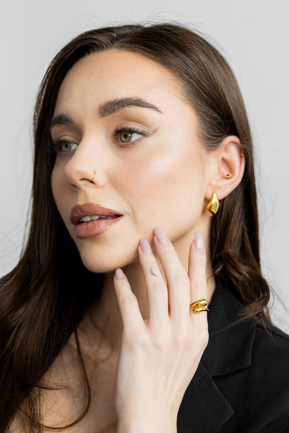 Subtelne, a jednocześnie wyraziste – te złote kolczyki o organicznej formie wykonane z mosiądzu to idealny dodatek dla kobiet, które cenią sobie oryginalny design. Lekkość formy i złoty połysk pięknie podkreślają rysy twarzy i dodają klasy każdej stylizacji – od biurowej po wieczorową.