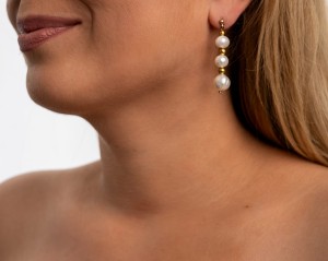 Kolczyki Perły Harmonia to eleganckie kolczyki z perłami w złotym wykończeniu, stworzone dla kobiet ceniących ponadczasową, klasyczną biżuterię. Trzy perły ułożone w subtelną, wydłużoną linię dodają twarzy blasku i lekkości, tworząc uniwersalny dodatek idealny zarówno na co dzień, jak i na specjalne okazje.