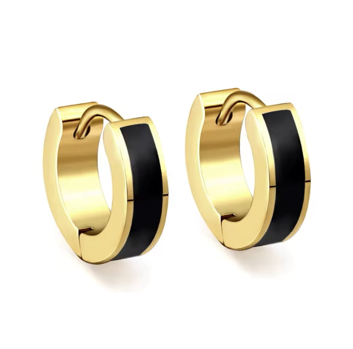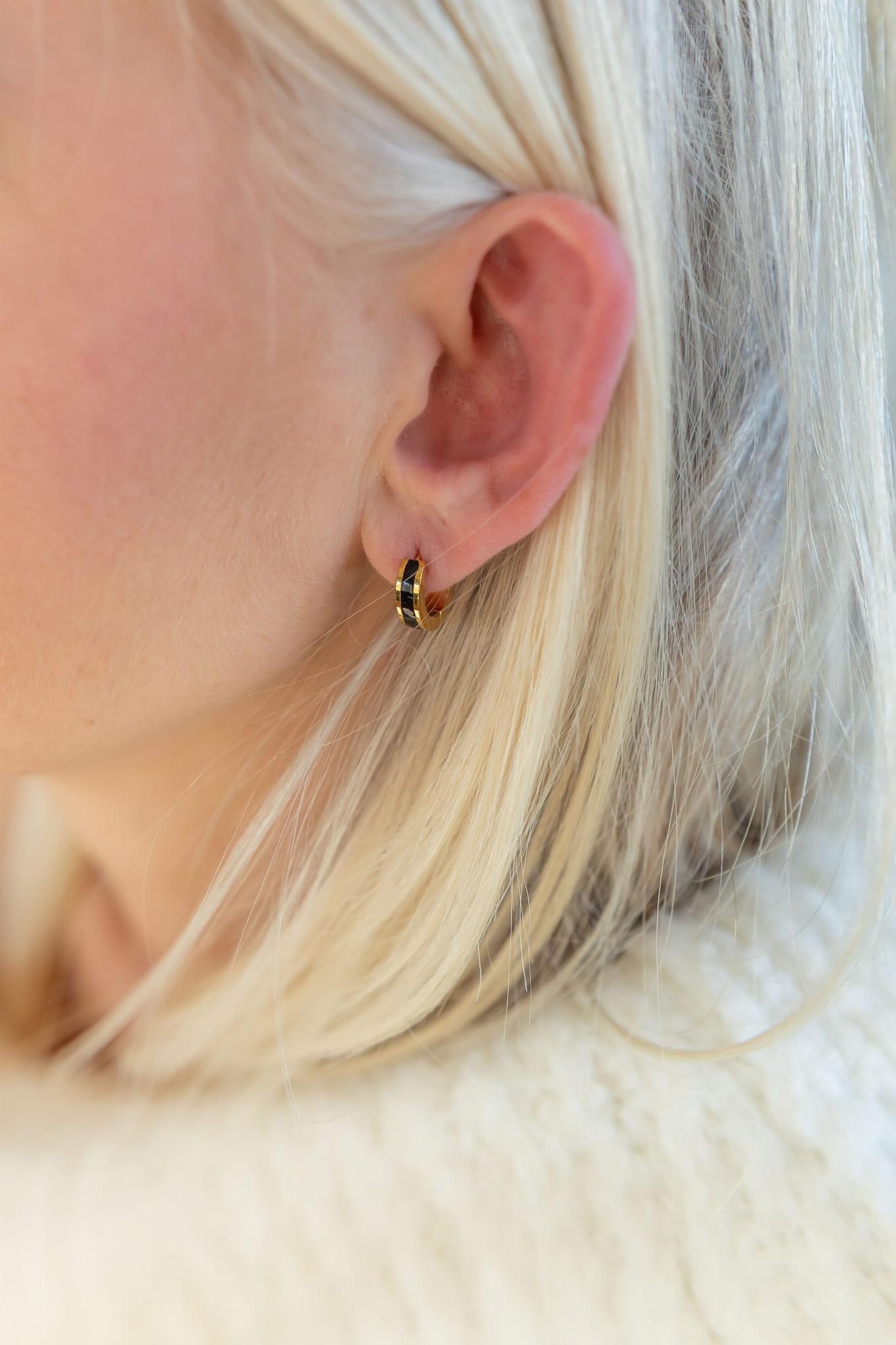Te kolczyki to harmonijne połączenie złotego blasku z głęboką, tajemniczą czernią. Elegancja spotyka tu minimalizm, tworząc design, który przyciąga spojrzenia, nie narzucając się jednak zbytnią ekstrawagancją. Idealne dla kobiety, która ceni klasykę, ale z nutą nowoczesności. Te kolczyki jak małe obręcze przypominają krąg nieskończoności – symbol wiecznej elegancji i niezależności. Nosząc je, wyrażasz swoją siłę i subtelność jednocześnie.