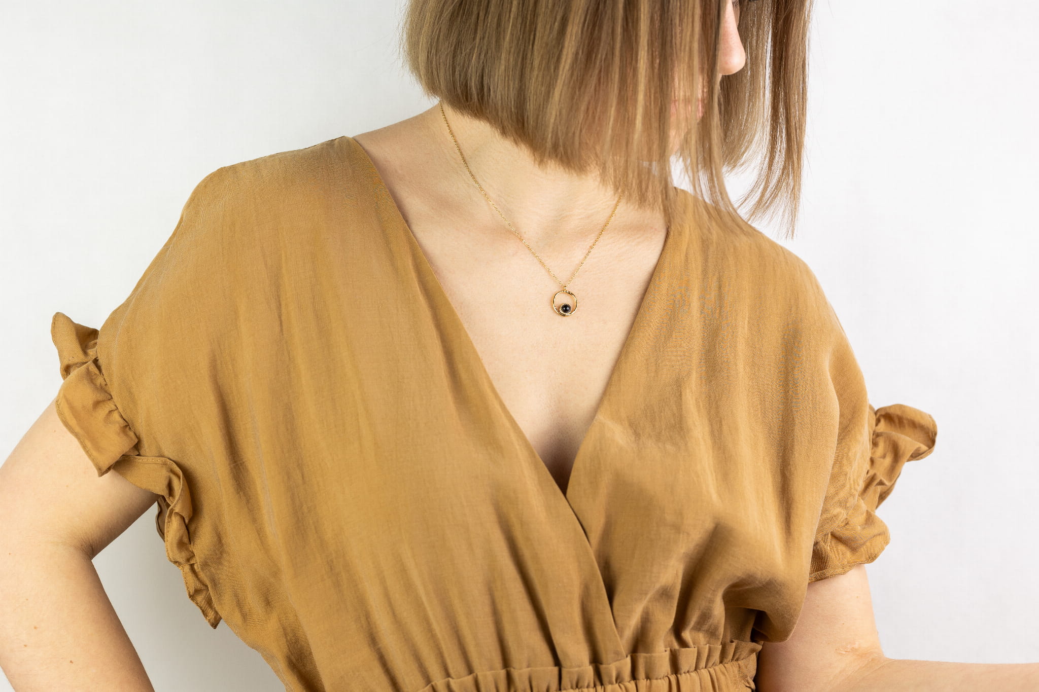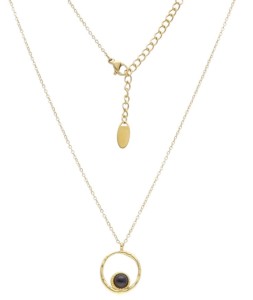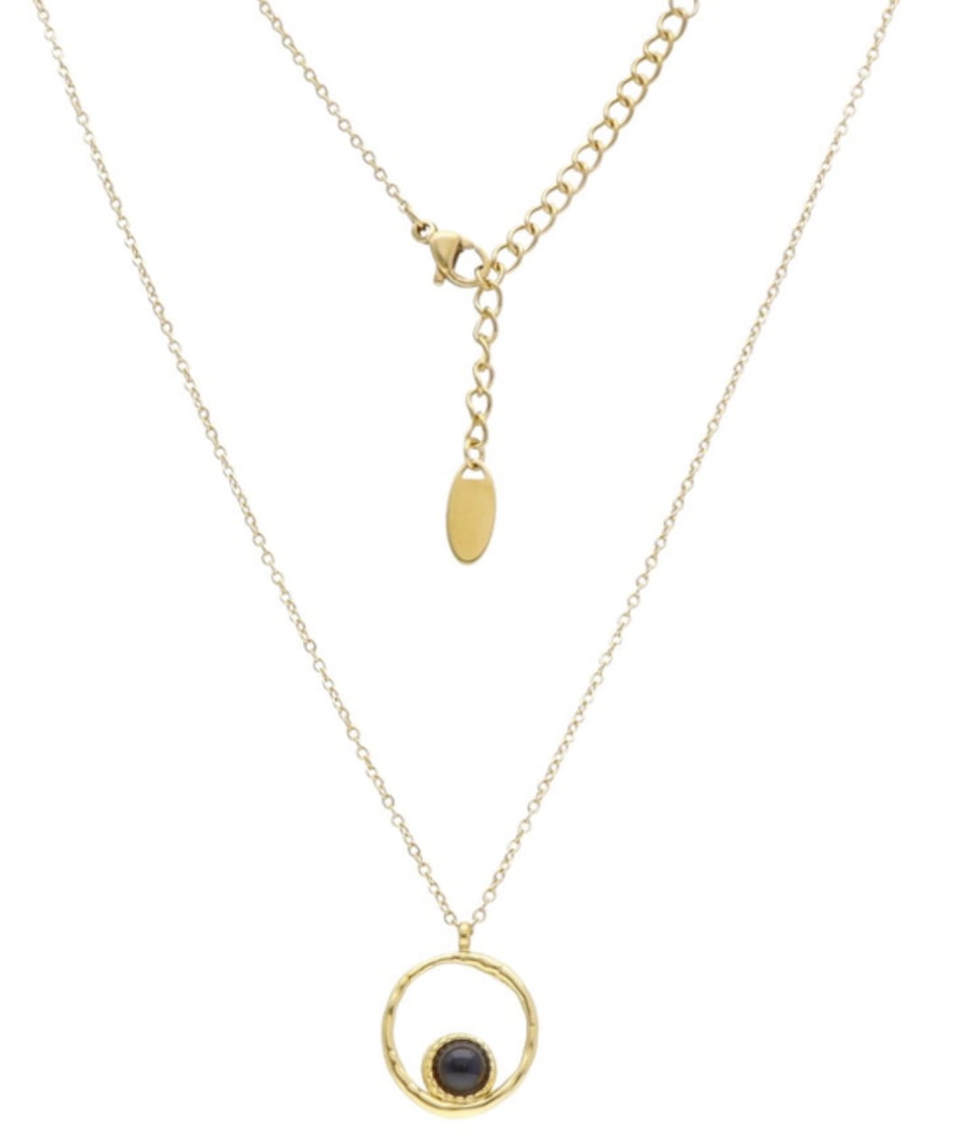 Elegancki naszyjnik wykonany ze stali szlachetnej w kolorze złotym. Główną ozdobą jest subtelny onyks osadzony w okrągłej zawieszce o delikatnej, młotkowanej strukturze. Regulowane zapięcie pozwala na idealne dopasowanie.