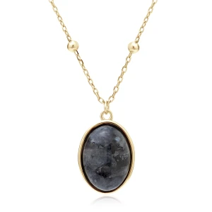 Elegancki i wyjątkowy naszyjnik z owalnym kamieniem larvikitem, oprawionym w złotą ramę. Larvikit, znany jako norweski kamień księżycowy, zachwyca swoim tajemniczym, ciemnoszarym odcieniem i delikatnymi refleksami. Zawieszony na subtelnym łańcuszku z ozdobnymi kulkami, naszyjnik łączy w sobie surowość naturalnego kamienia z luksusowym blaskiem złota. Idealny dla kobiet ceniących biżuterię inspirowaną naturą i eleganckim minimalizmem.