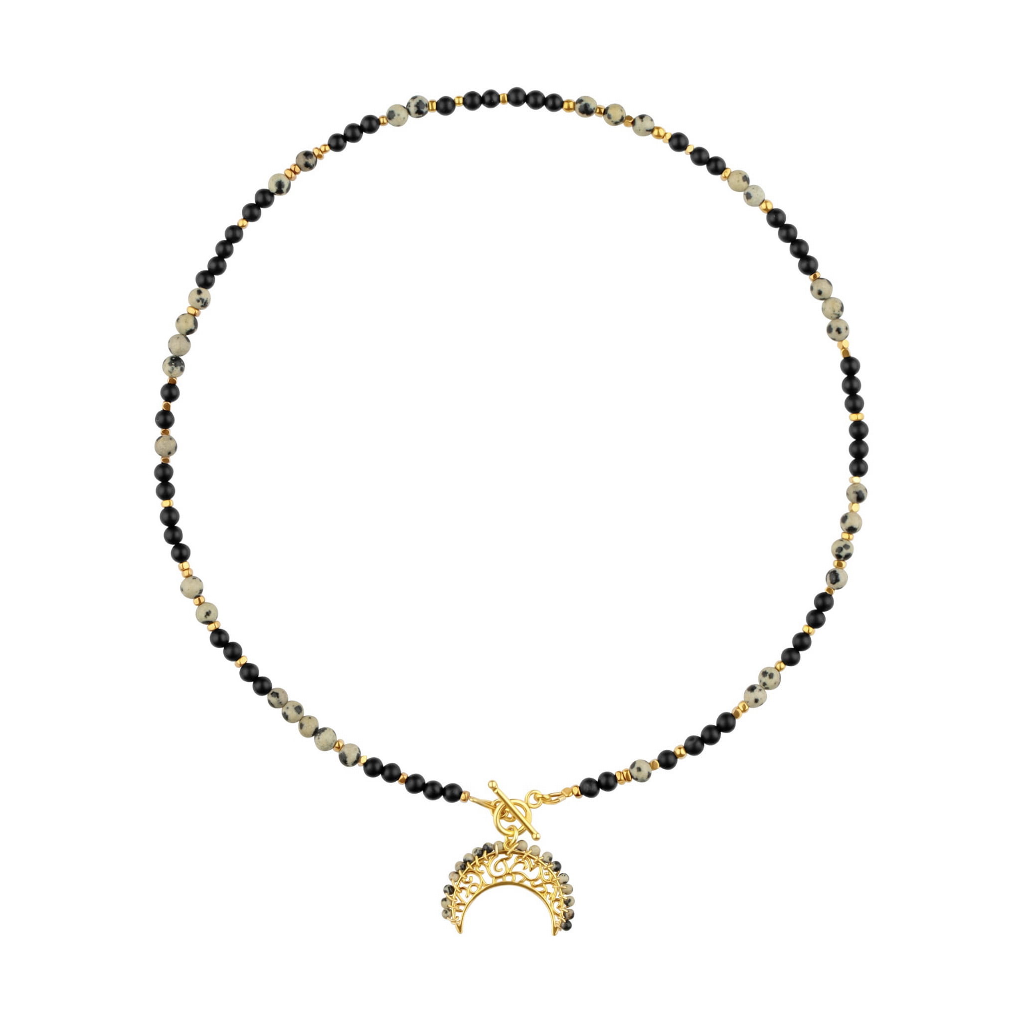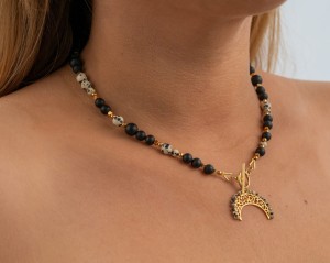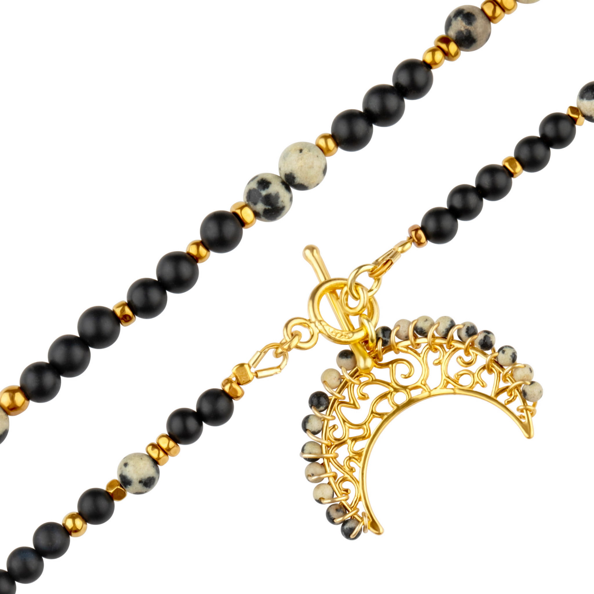 Na zdjęciu naszyjnik Dina, z jaspisem dalmatyńskim w roli głównej – kamieniem, który wspiera odwagę, równowagę i radość życia.