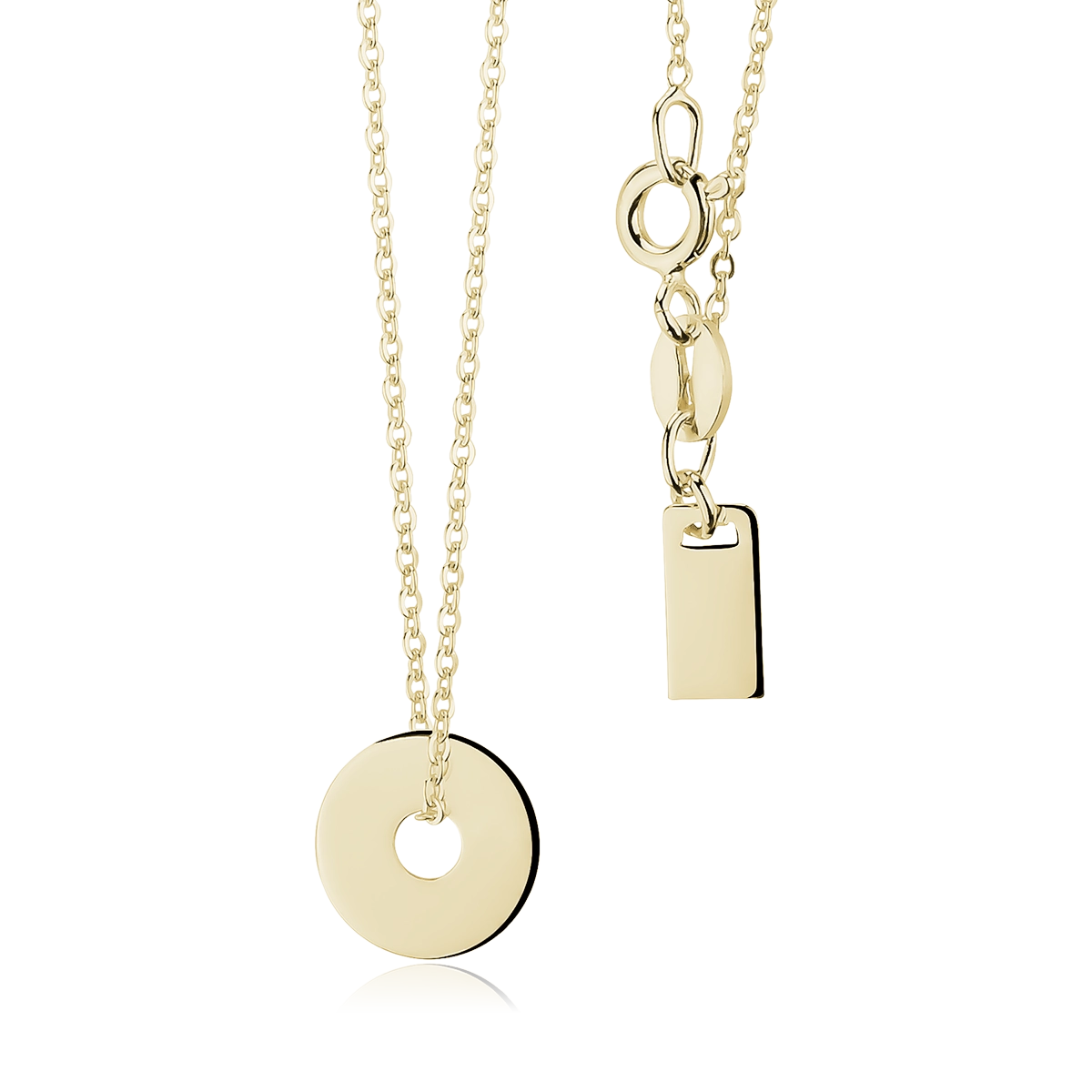 Subtelny i elegancki naszyjnik wykonany z najwyższej jakości srebra, pokryty 14-karatowym złotem. Jego minimalistyczny design łączy dwa delikatne elementy: okrągłą zawieszkę z wycięciem oraz prostokątną płytkę, które tworzą harmonijną całość.