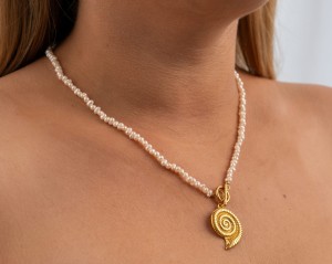 Elegancki naszyjnik z naturalnych pereł to ponadczasowy dodatek, który łączy klasykę z nowoczesnym akcentem. Subtelne, drobne perły w ciepłym, kremowym odcieniu pięknie układają się na szyi, tworząc delikatną i kobiecą formę. Centralnym punktem naszyjnika jest złota zawieszka w kształcie muszli, która nadaje całości wyjątkowego, biżuteryjnego charakteru inspirowanego naturą i motywami morskimi.