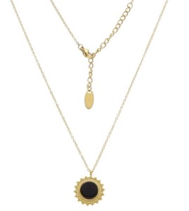 Elegancki naszyjnik wykonany z wysokiej jakości stali szlachetnej, ozdobiony zawieszką w kształcie subtelnego słońca z czarnym onyksowym oczkiem w centrum. Minimalistyczny, ale efektowny design sprawia, że doskonale sprawdzi się zarówno na co dzień, jak i na wyjątkowe okazje.
