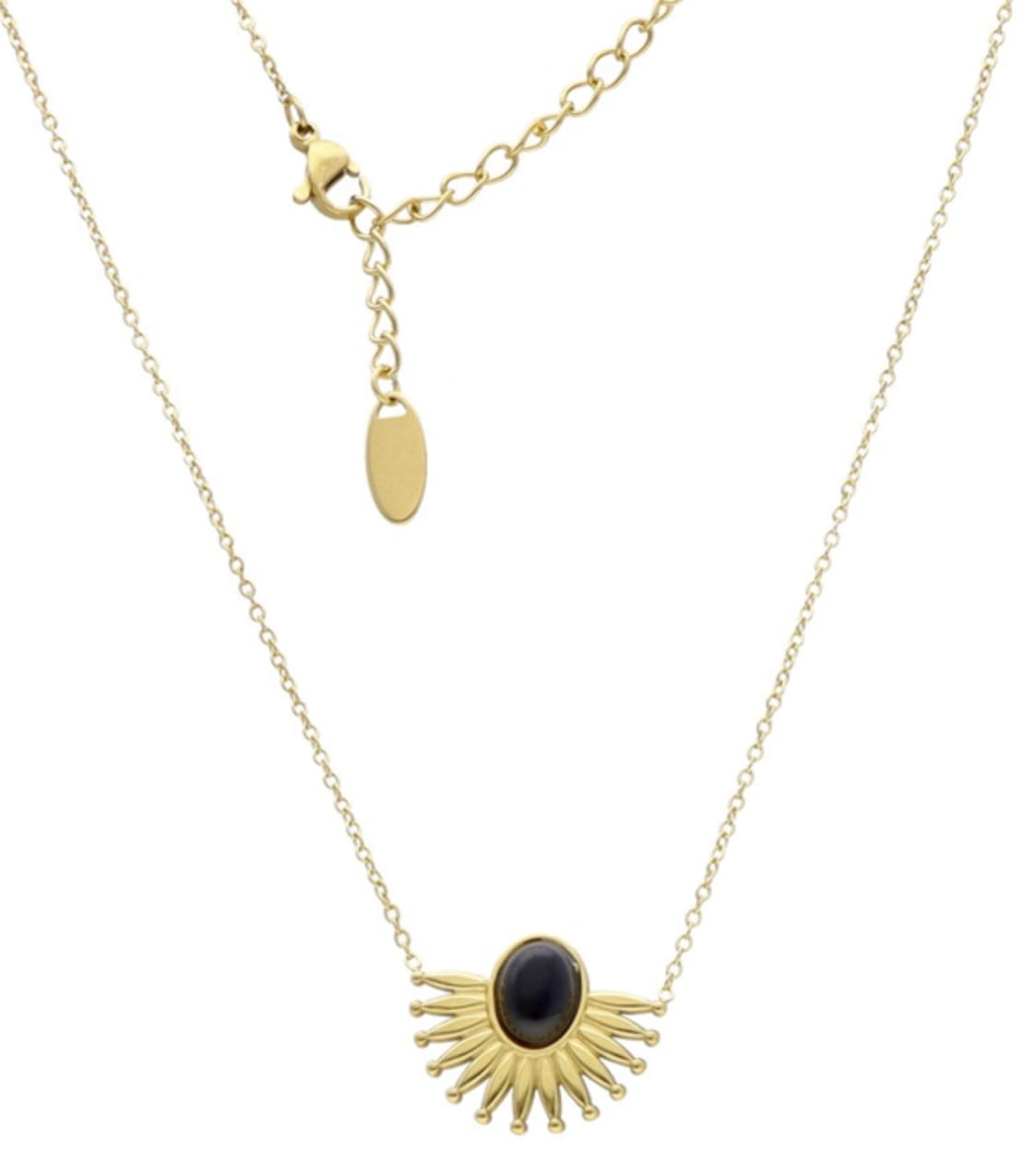 Stylowy naszyjnik wykonany ze stali szlachetnej w kolorze złotym, z zawieszką inspirowaną kształtem słońca. W centrum zawieszki znajduje się naturalny onyks, który nadaje naszyjnikowi wyjątkowego charakteru i elegancji. Delikatny łańcuszek oraz regulowana długość czynią go wygodnym w noszeniu i idealnym na każdą okazję.