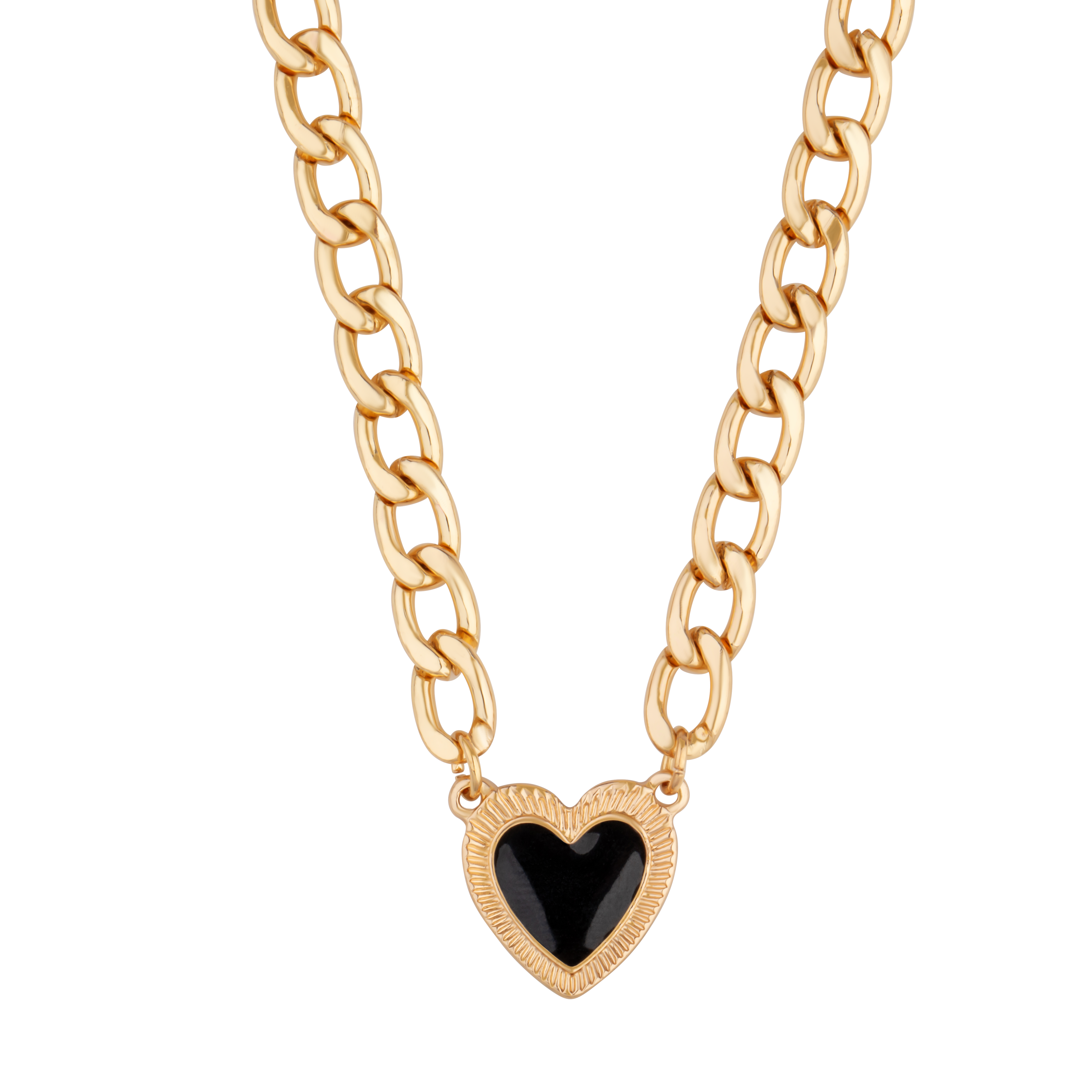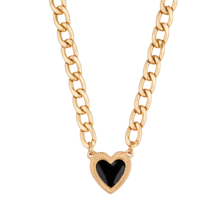 Elegancki naszyjnik z grubym, złotym łańcuchem i sercem w kolorze czarnym, które stanowi centralny punkt ozdoby. Połączenie klasycznego łańcucha z czarnym sercem nadaje mu wyjątkowy styl – romantyczny, a jednocześnie nowoczesny. Idealny dla kobiet, które cenią sobie oryginalne i wyraziste dodatki. Ten naszyjnik świetnie dopełni zarówno wieczorowe stylizacje, jak i bardziej casualowe outfity, dodając każdemu z nich elegancji i szyku.