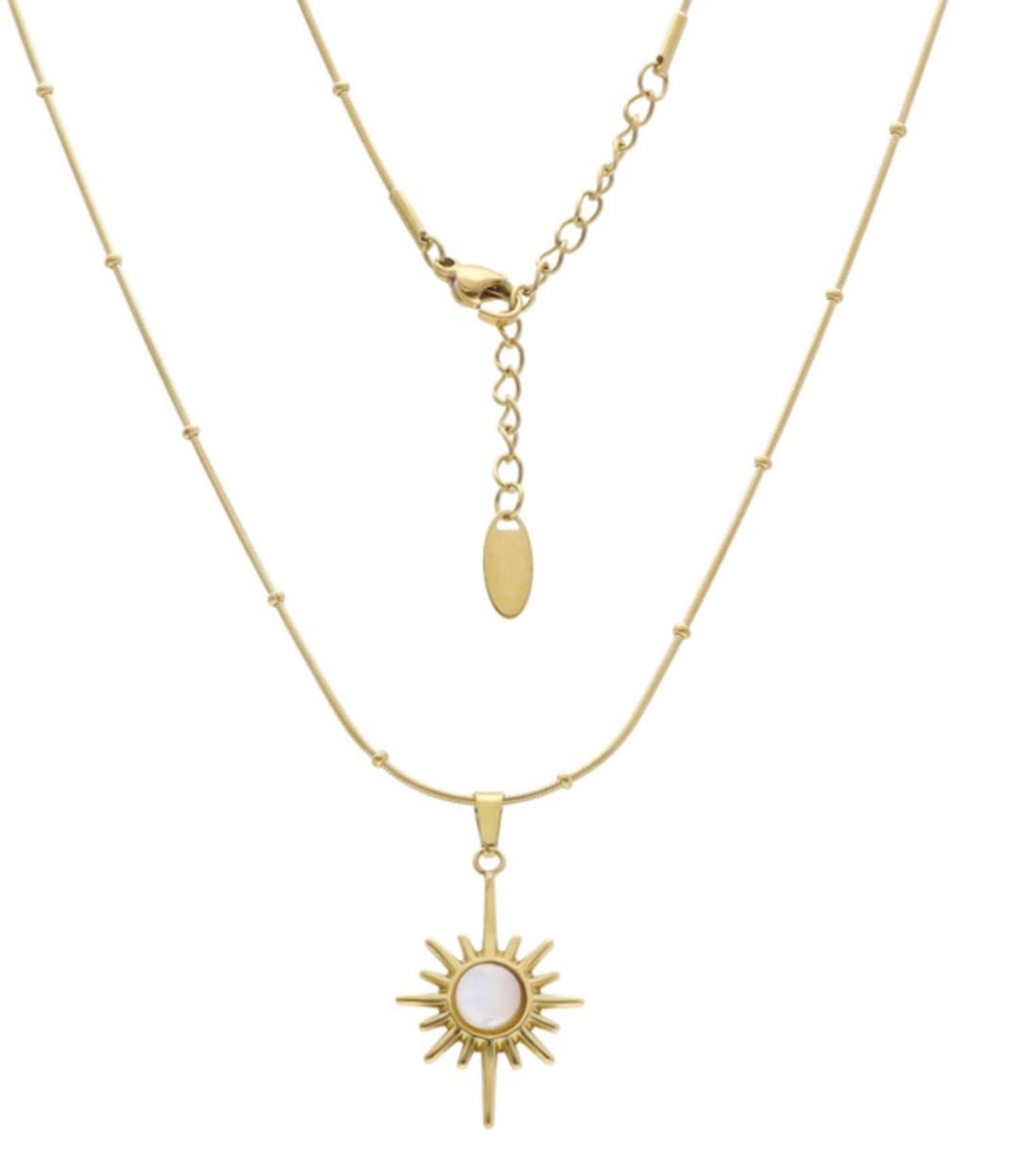 Delikatny i elegancki naszyjnik wykonany z wysokiej jakości stali szlachetnej, ozdobiony zawieszką w kształcie gwiazdy, którego centrum zdobi subtelna masa perłowa. Połączenie złotego wykończenia z naturalnym blaskiem masy perłowej tworzy harmonijną i ponadczasową kompozycję.