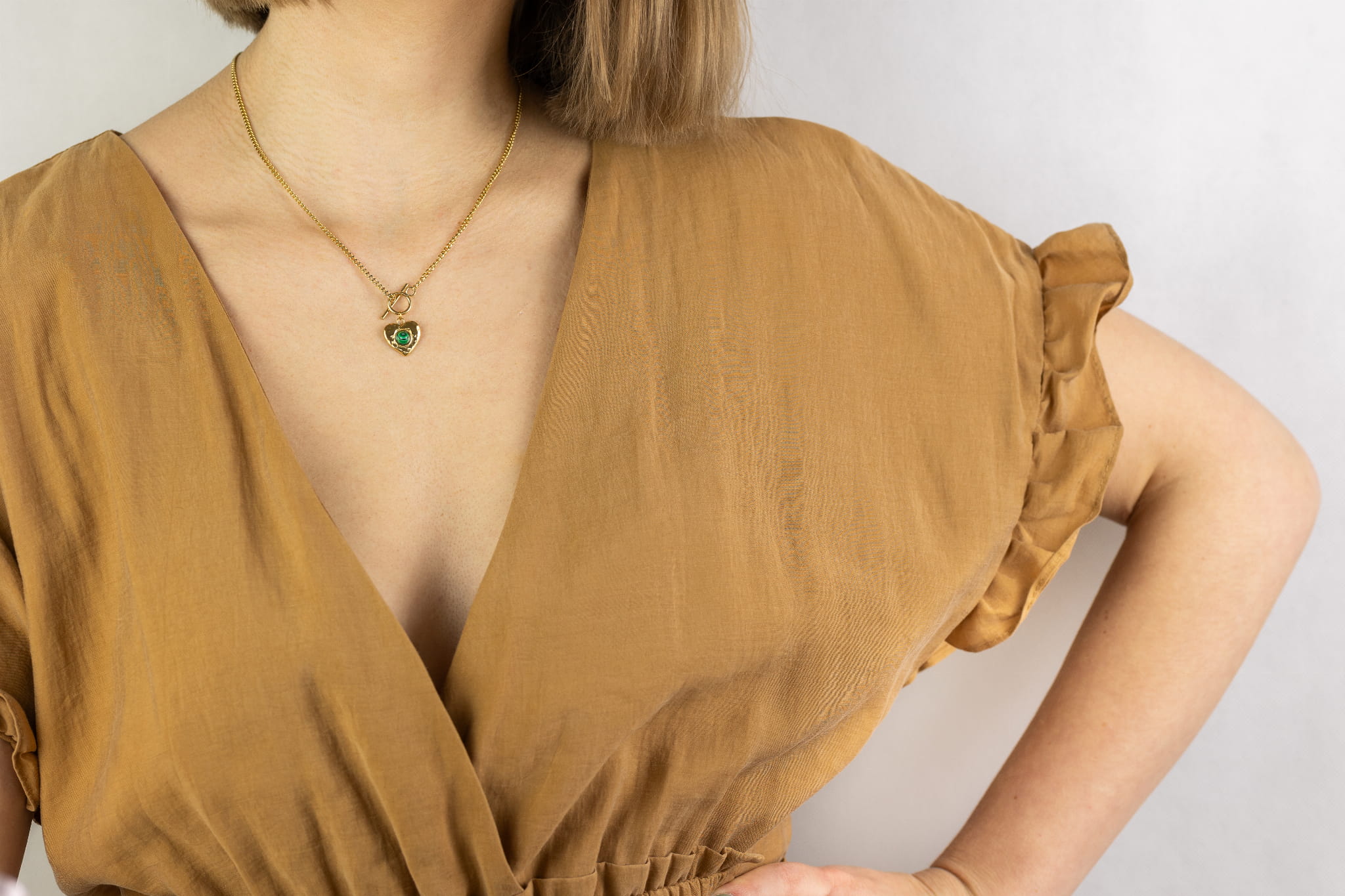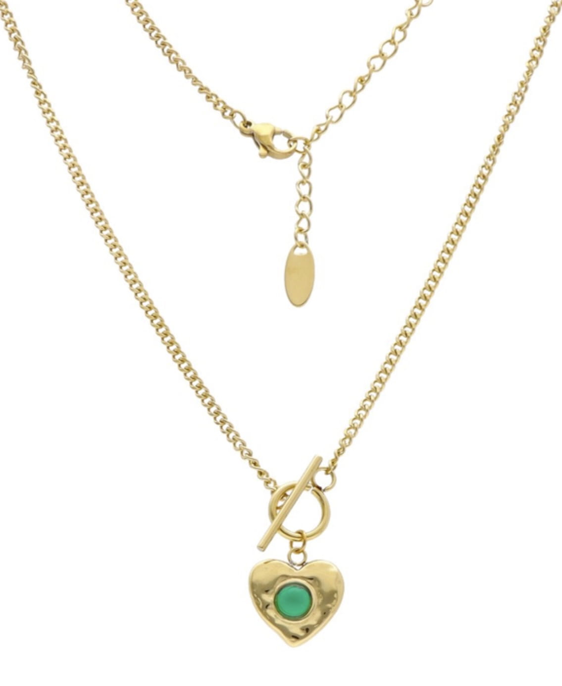 Romantyczny naszyjnik wykonany ze stali szlachetnej w kolorze złotym, ozdobiony zawieszką w kształcie serca. Centralnym punktem zawieszki jest naturalny malachit, który nadaje całości wyjątkowego uroku. Naszyjnik wyposażony jest w stylowe zapięcie typu toggle, które nie tylko ułatwia zakładanie, ale stanowi dodatkowy element dekoracyjny.