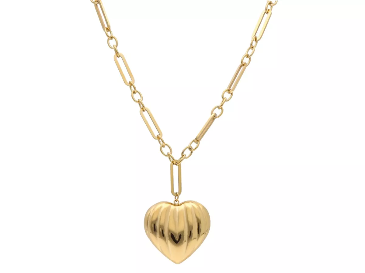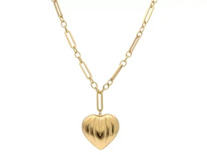 Ten naszyjnik to wyraz odważnej kobiecości i nowoczesnej elegancji. Duże, wypukłe serce o subtelnie żłobionej powierzchni przyciąga spojrzenia, a masywny łańcuch o wydłużonych ogniwach dodaje całości modowego charakteru. To biżuteria, która mówi sama za siebie – idealna dla kobiet, które nie boją się wyrażać emocji i stawiać na wyraziste akcenty.