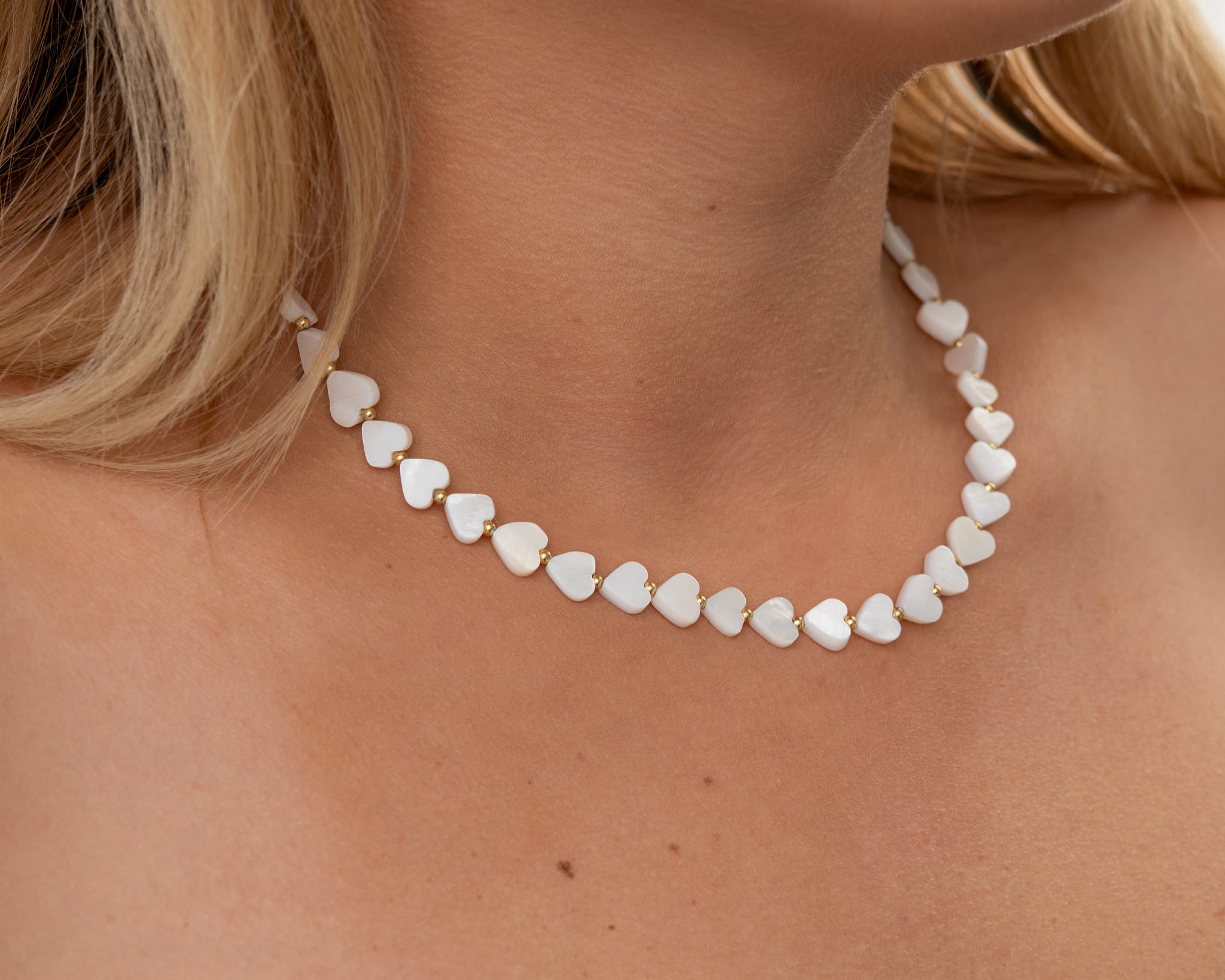 Naszyjnik z masy perłowej w kształcie serduszek to delikatna i elegancka biżuteria damska. Idealny na prezent, do letnich stylizacji i codziennego noszenia. Naturalna masa perłowa i złote detale podkreślają kobiecy charakter naszyjnika.