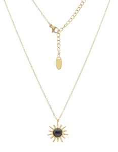 Zjawiskowy naszyjnik wykonany ze stali szlachetnej w złotym kolorze, ozdobiony zawieszką w kształcie promiennego słońca. W centralnej części zawieszki znajduje się naturalny onyks, który przyciąga uwagę głębią koloru i elegancją. Regulowana długość naszyjnika zapewnia wygodę noszenia oraz możliwość dopasowania do każdej stylizacji.