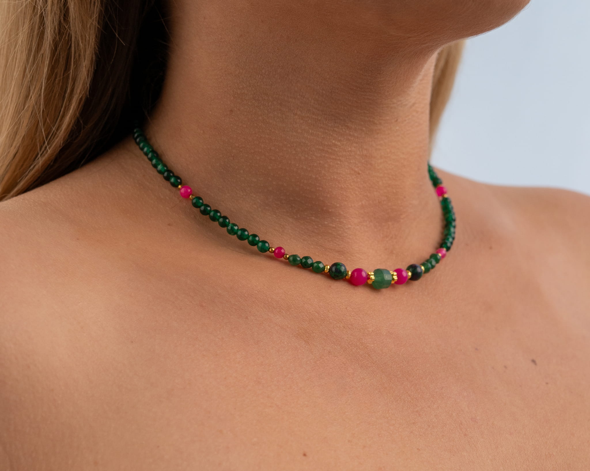 Ten delikatny naszyjnik z kamieni naturalnych to subtelne połączenie elegancji i koloru. Drobne koraliki w głębokim odcieniu zieleni zostały przełamane akcentami w intensywnym różu oraz złotymi detalami, tworząc harmonijną, kobiecą kompozycję. Naszyjnik pięknie układa się na szyi, podkreślając dekolt i nadając stylizacji lekkości.