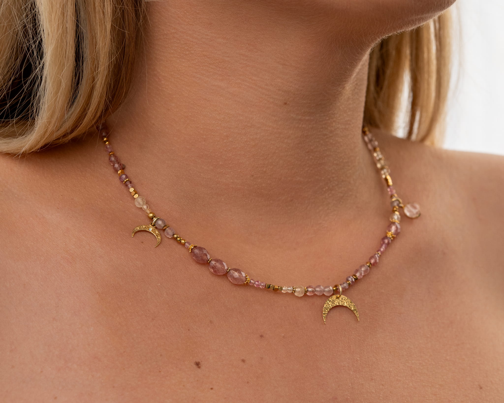 Naszyjnik Volta to biżuteria inspirowana cyklem księżyca i delikatnością natury. Wykonany z naturalnego kwarcu w pudrowo-różowych tonach, pięknie odbija światło i subtelnie podkreśla dekolt. Zawieszki w kształcie półksiężyca, wykonane ze srebra pozłacanego, dodają całości mistycznego charakteru i kobiecej energii.