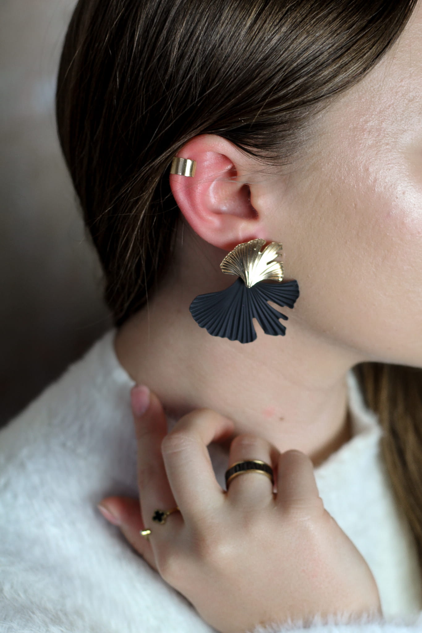 Minimalistyczna nausznica w kolorze złotym, wykonana z delikatnie połyskującego metalu. Jej prosta forma i szeroki kształt sprawiają, że jest idealnym dodatkiem do codziennych oraz wieczorowych stylizacji. Wygodna w noszeniu, subtelnie podkreśla ucho, dodając stylizacji elegancji i nowoczesności.