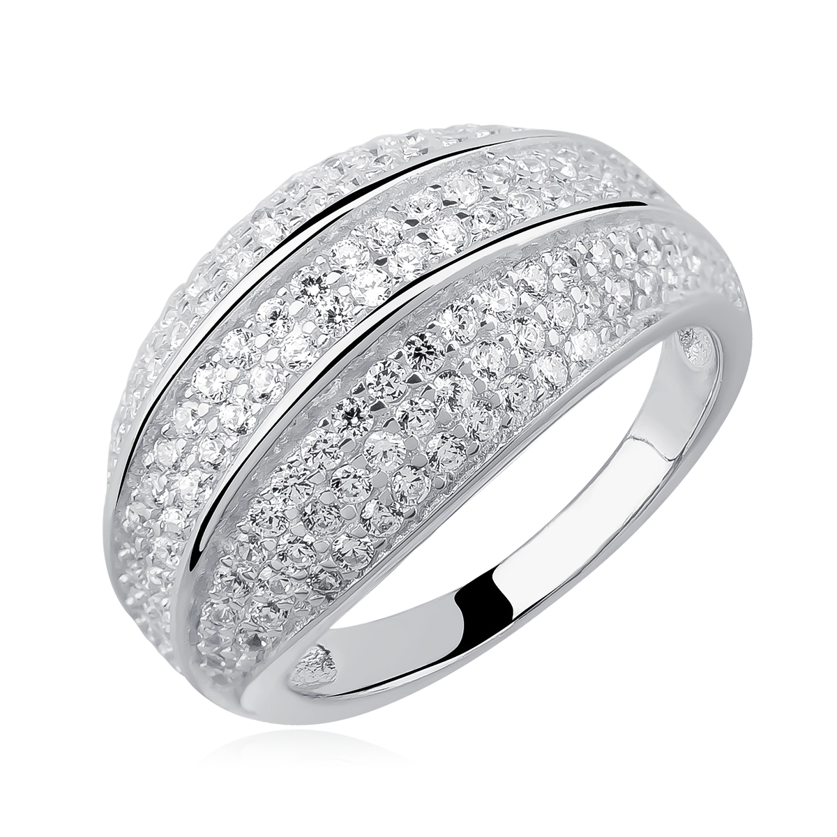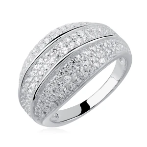 Ten olśniewający pierścionek wykonany z wysokiej jakości srebra próby 925 zachwyca precyzją wykonania i luksusowym wyglądem. Wielopoziomowe zdobienie z drobnych, białych cyrkonii tworzy oszałamiający efekt blasku, który pięknie odbija światło. Wyprofilowane linie dodają mu nowoczesnego charakteru, czyniąc go idealnym wyborem zarówno na wyjątkowe okazje, jak i do codziennych stylizacji.
