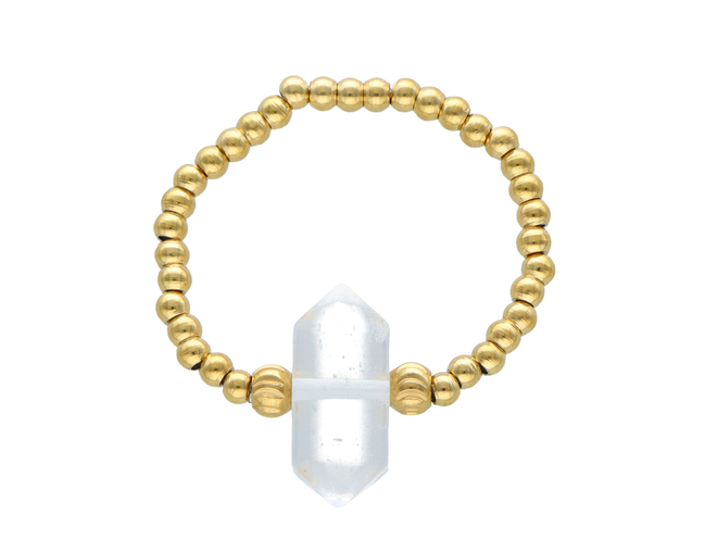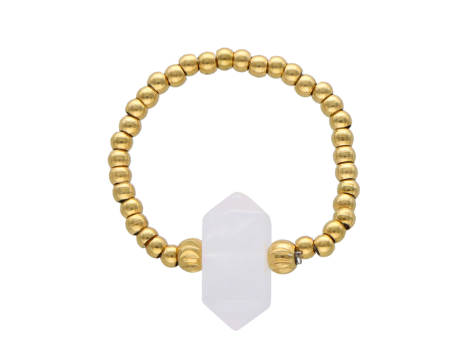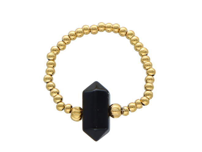 Stylowy pierścionek na elastycznej gumce, wykonany ze stali szlachetnej, ozdobiony centralnym kamieniem w kształcie podłużnego kryształu. Do wyboru trzy wyjątkowe warianty kamieni: głęboki czarny onyks, subtelny kwarc różowy lub przejrzysty kryształ górski. Złote koraliki dodają elegancji i harmonijnie komponują się z wybranym kamieniem. Dzięki elastycznej gumce pierścionek idealnie dopasowuje się do każdego palca, zapewniając komfort noszenia. Idealny dodatek, który łączy nowoczesny design z klasycznym pięknem naturalnych kamieni.